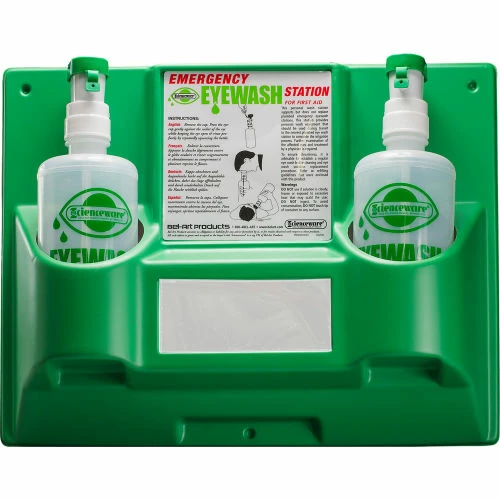- Quick instruction diagrams on the bottle and station confirm how to use the eyewash bottle