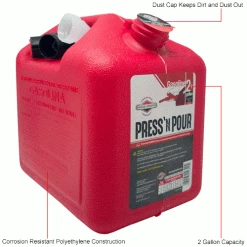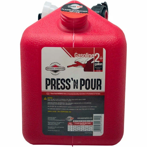 The Garage Boss Press ‘N Pour 2+ Gallon Fuel Filling System is the perfect solution to keep your small to medium size gas powered equipment running year round or to mix your 2 cycle oil. Whether it be your lawn mower, snow blower or leaf blower, the ergonomically friendly design makes fueling your equipment easy and clean.