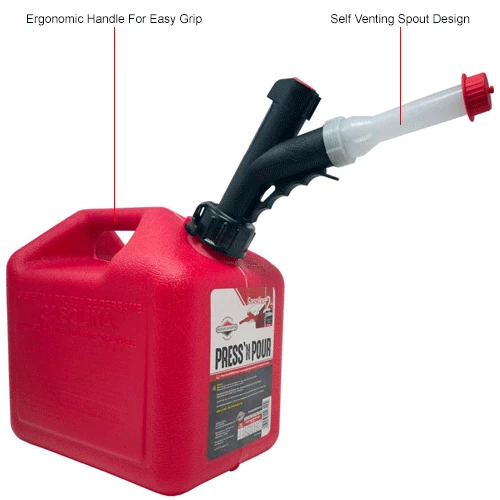 Step up to a safer can with the GarageBOSS Press ‘N Pour portable fuel container. Made in the USA and meeting and exceeding all safety regulations of ASTM, EPA and CARB. The GarageBOSS Press ‘N’ Pour Can contains a permanently affixed FlexFMD Flame Mitigation Device. This FlexFMD contains over 100,000 perforations protecting against flame jetting while not impeding flow in or out. The innovative Press ‘N Pour spout with fuel pump inspired ergonomic grip allows for precision flow control with a simple press of the button. The Press ‘N Pour spout automatically shuts off and has a self venting spout design while being senior friendly and child safe.