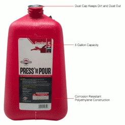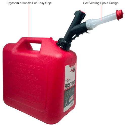 The Garage Boss Press ‘N Pour 5 Gallon Fuel Filling System is the perfect solution to keep your medium to large size gas powered equipment running year round. Whether it be your ride-on mower, ATV, snowmobile or motorized watercraft, the ergonomically friendly design makes fueling your equipment easy and clean. This is a Briggs and Stratton endorsed product.