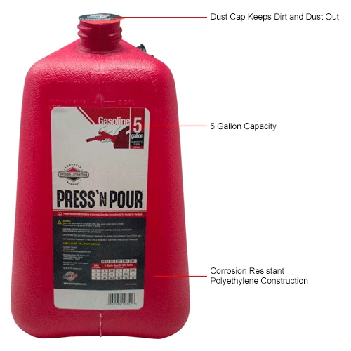 Step up to a safer can with the GarageBOSS Press ‘N Pour portable fuel container. Made in the USA and meeting and exceeding all safety regulations of ASTM, EPA and CARB. The GarageBOSS Press ‘N’ Pour Can contains a permanently affixed FlexFMD Flame Mitigation Device. This FlexFMD contains over 100,000 perforations protecting against flame jetting while not impeding flow in or out. The innovative Press ‘N Pour spout with fuel pump inspired ergonomic grip allows for precision flow control with a simple press of the button. The Press ‘N Pour spout automatically shuts off and has a self venting spout design while being senior friendly and child safe.