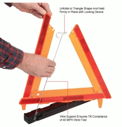 Cortina triangle reflector warning kits meet or exceed all DOT FMVSS125 requirements, thus ensuring that your fleet and the motoring public have the finest product available. The triangle’s wire form support guarantees tilt compliance of 40 mph wind test. Opaque container protects fluorescent color from UV deterioration. The living hinge box ensures that the lid won’t separate from the box.