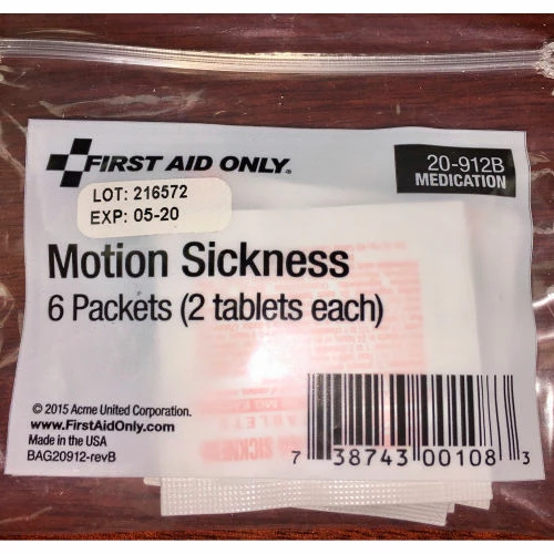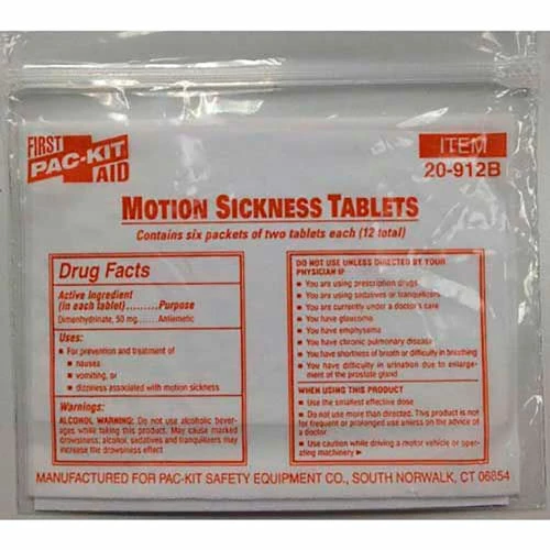 Anti-seasickness tablets for use in lifeboats and life rafts. Contains six packets of 2 tablets each (12 total).