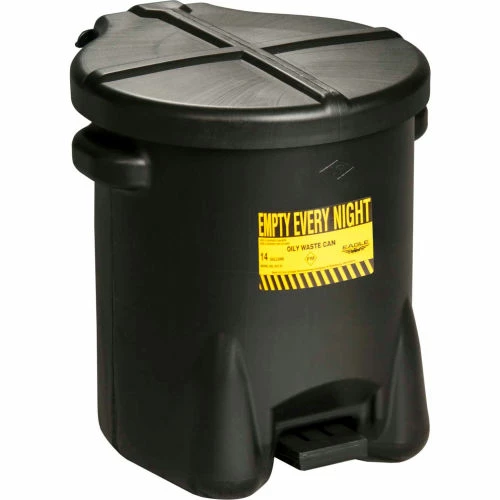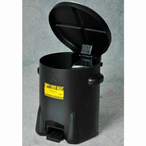14 gal. Black Polyethylene Oily Waste Cans are constructed of black high density polyethylene (HPDE) and offer fire safe temporary storage of solvent rags, waste rags, shavings and other materials subject to spontaneous combustion. Will not rust or dent, are resistant to most chemical compounds, have no seam for a leak proof construction, and feature self-closing lid with foot lever and with a flared base for added stability. FM Approved. 100% designed and manufactured in the USA. Compliance: OSHA 29 CFR 1910.125(e)(4)(ii) and OSHA 29 CFR 1910.125(e)(4)(iii).