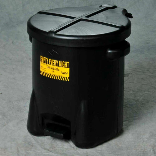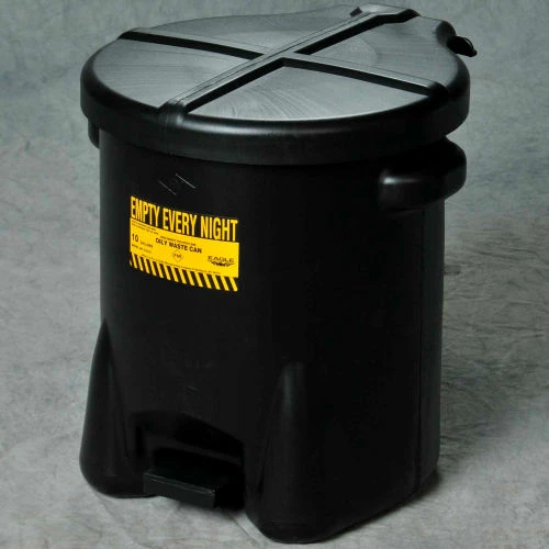6 gal. Black Polyethylene Oily Waste Cans are constructed of black high density polyethylene (HPDE) and offer fire safe temporary storage of solvent rags, waste rags, shavings and other materials subject to spontaneous combustion. Will not rust or dent, are resistant to most chemical compounds, have no seam for a leak proof construction, and feature self-closing lid with foot lever and with a flared base for added stability 100% designed and manufactured in the USA. Compliance: OSHA 29 CFR 1910.125(e)(4)(ii) and OSHA 29 CFR 1910.125(e)(4)(iii).
