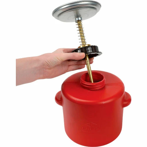 Polyethylene plunger can helps safely moisten cleaning cloths or swabs without spilling flammable or volatile liquids. When 5-1/4″ dia. dasher plate is pushed down, the can dispenses a small amount of liquid. Surplus liquid drains back into reservoir using brass plunger and pump assembly. Flame arrestor dasher screen. Can has a capacity of 1 quart. Complies with OSHA standards. FM approved.