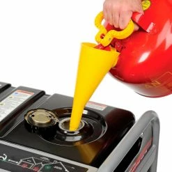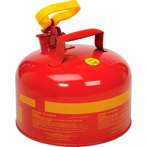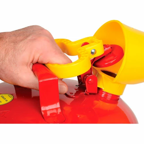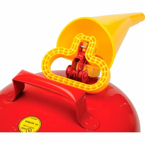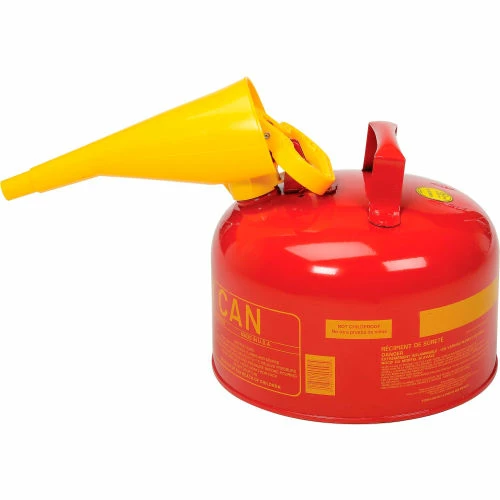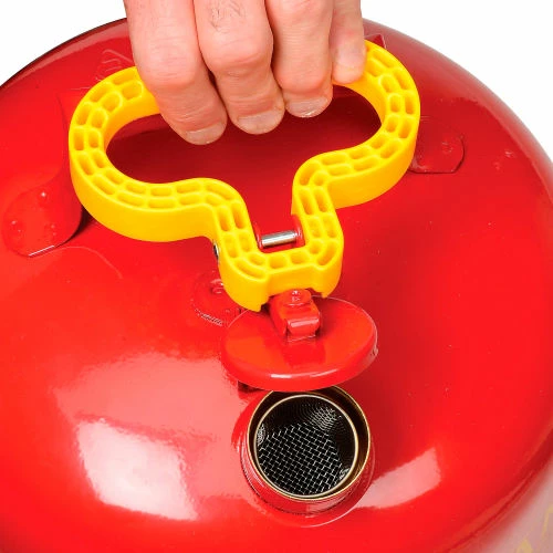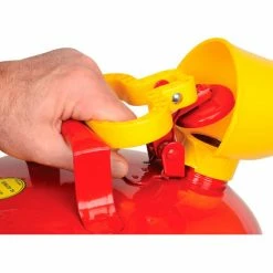 This Type I Safety Can holds 2.5 gallons and is manufactured with hot-dipped 24-gauge galvanized steel. Deep drawn seamless construction with no top or side seam. Double interlock no-weld bottom seam. Trilingual label. Red baked on powder coat finish. Non-sparking flame arrestor and pour spout. Patented comfort grip trigger release. Fixed handle, included HDPE funnel fits unleaded fuel tanks. Meets OSHA & NFPA Code 30 requirements, FM, UL, ULC Approved.