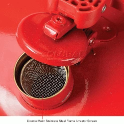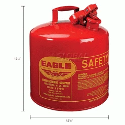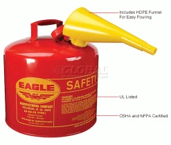 This Type I Safety Can holds 5 gallons. Manufactured with hot-dipped 24-gauge galvanized steel. Deep drawn seamless construction with no top or side seam. Double interlock no-weld bottom seam. Trilingual label. Red baked on powder coat finish. Non-sparking flame arrestor and pour spout. Patented comfort grip trigger release. Fixed handle. Includes HDPE funnel which fits unleaded fuel tanks. Meets OSHA & NFPA Code 30 requirements, FM, UL, ULC Approved.
