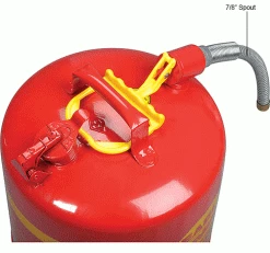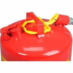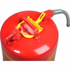 This Type II Safety Can holds 5 gallons. Manufactured with hot-dipped 24-gauge galvanized steel. Deep drawn seamless construction with no top or side seam. Double interlock no-weld bottom seam. Trilingual label. Red baked on powder coat finish. Fixed handle, 7/8″ Spout. Meets OSHA & NFPA Code 30 requirements, FM, UL, ULC Approved.
