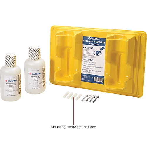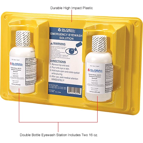 All those in favor of workplace safety say ‘eye.’ The Global Industrialâ„¢ Double Bottle Eyewash Station is a great back up for a quick response to eye accidents in large work environments, where employees might need immediate treatment. The smaller size of these stations is ideal for mounting in workspaces when irritation, burning, and itching occur from dust, smoke, or chemical contamination is possible. The removable bottles are also perfect for portable use when transporting an injured worker to a facility for further medical care. Place them within a 10 second walk from hazards to meet OSHA standards. 1 Year Limited Warranty.