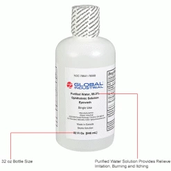 The Global Industrial™ Emergency Eyewash Bottle is compatible with the Global Industrial™ Double Bottle Eyewash Stations, 708570SS and 708570DS. Made of 98.3 percent ophthalmic solution and ideal for use in high-hazard areas, this eyewash bottle provides relief when irritation, burning, and itching occur from dust, smoke, or chemical contamination. Size: 16 oz.