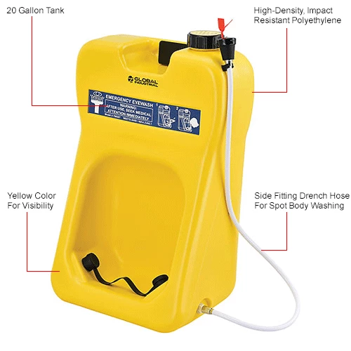 The Global Industrial™ Gravity Fed Portable Eyewash Station is made to occupy less space while providing essential eye washing needs to workers. This compact and standalone emergency station is mountable to the wall of any nearby working location for quick access to eye flushing or spot washing. The open basin design allows the user to promptly begin flushing once the dual spray heads are activated. A convenient drench hose is fitted at the side of the basin for users that need to quickly spot-wash away chemical exposure on the body. Robust, rotomolded plastic body ensures lasting durability and a strong resistance to impacts that can occur during emergency flushing. Bright yellow color finish distinguishes clear visibility from a variety of approaching distances. This unit meets ANSI Z358.1-2009. 1 Year Limited Warranty.