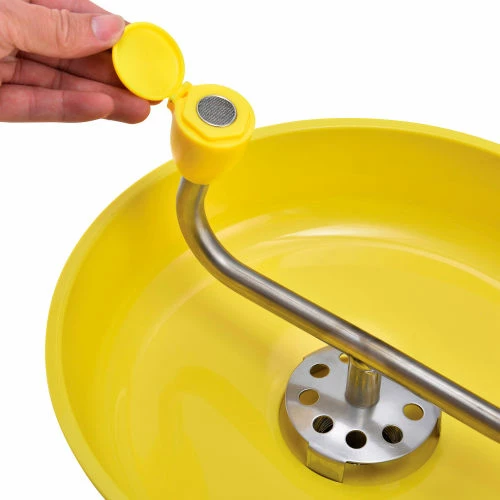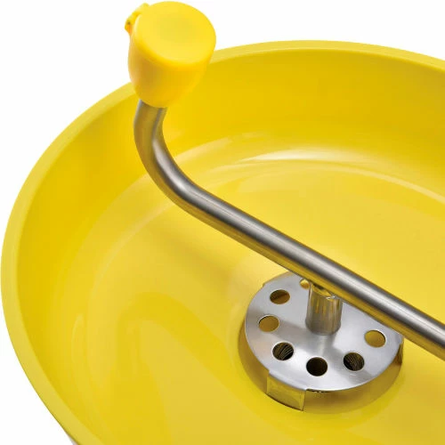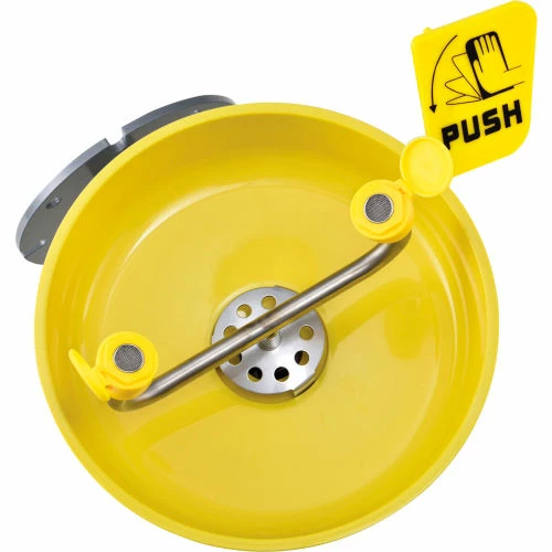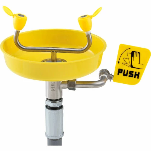 The Globalâ„¢ Industrial Eye Wash Station is essential for industrial spaces where accidents can occur with chemicals or hazardous substances. Mounts easily to the wall to provide immediate, reliable and effective treatment in nearby working locations. Equipped with a stay open ball valve that is activated by a push handle, allowing hands free operation once the eyewash has been activated. Dual spray heads feature “flip top” covers to protect from dust particles. Schedule 40 galvanized steel includes safety yellow polyethylene covers for corrosion resistance and easy visibility. Includes ANSI Compliant identification sign. ANSI Z358.1-2014.