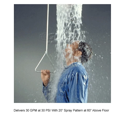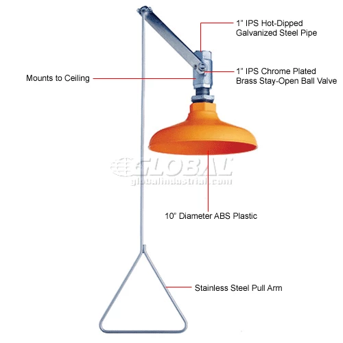 10″ high volume orange ABS plastic showerhead delivers 30 GPM flow and 20″ spray pattern at 60″ above the floor. Large size pull rod is easily located. Stay open ball valve permits hands free operation. Activates in one second or less. Ceiling mount, plumbing required.
