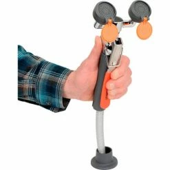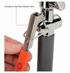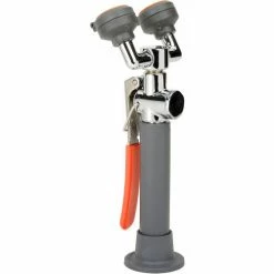 Dual purpose deck mounted eye wash/drench hose unit meets the requirements of ANSI Z358.1 as a primary eye wash. Spray assembly can be left as a fixed eye wash or it can be removed to use as a drench hose. Eliminates the need for separate eye washes and drench hoses. Never lose dust covers again! Spray head assembly has two Gentle Spray outlet heads with “flip-top” dust covers mounted on chrome plated brass supply arms. Activated by stay-open, chrome plated squeeze valve. All wearing components are accessible for ease of service. 8′ reinforced PVC hose. 300 PSI hose rating. Fully factory assembled and water tested. Complete with ANSI compliant identification sign.
