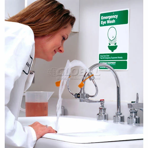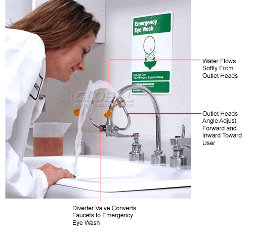 Converts most faucets into an emergency eye wash. Aerated outlet heads are mounted 5″ apart and angle forward and inward toward user. Outlet heads deliver a soft flow of water for gentle rinsing action. The angle of the heads is adjustable to permit ease of access and avoid splashing on the counter or the floor. Dust covers are included to protect outlet heads. Brass diverter valve makes it easy for hands free operation. Does not include identification sign.
