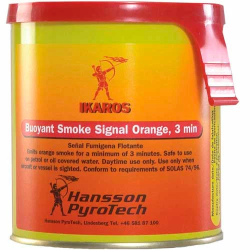 Ikaros 3 Minute Buoyant Orange Smoke USCG/SOLAS/MED. Global Approvals – USCG, CA-DOT, BV/MED/SOLAS. > 3 min of dense orange smoke. Dimension: 95 x 101 mm, Weight: 510 Grams. Applications: For daylight distress signaling purposes on ships, lifeboats, liferafts and recreational vessels. Design and Function: The case is made of corrosion resistant steel and has clear and simple instructions. Remove the red top lid – Pull the loop – Throw the signal into the water.