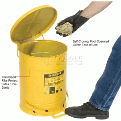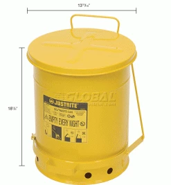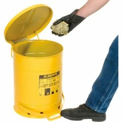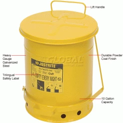 Dispose of oily and combustible trash safely. This 10 gallon step on garbage can has a raised, ventilated bottom which allows air-flow to help prevent spontaneous combustion. Oily waste can has self-closing, foot-operated lid and large folding carry handle. Trash can is made of heavy gauge galvanized steel and has durable powder coat finish. 10 Year Limited Warranty.