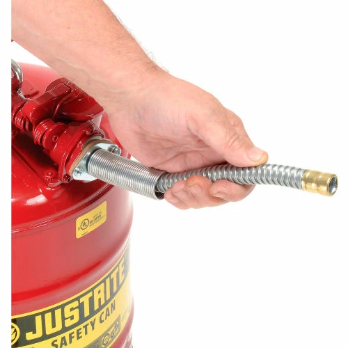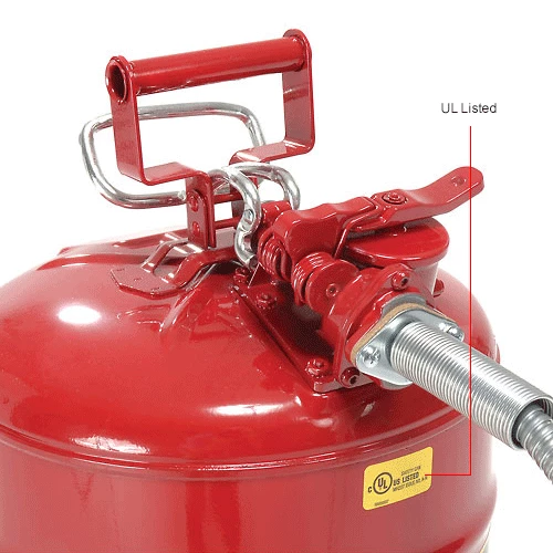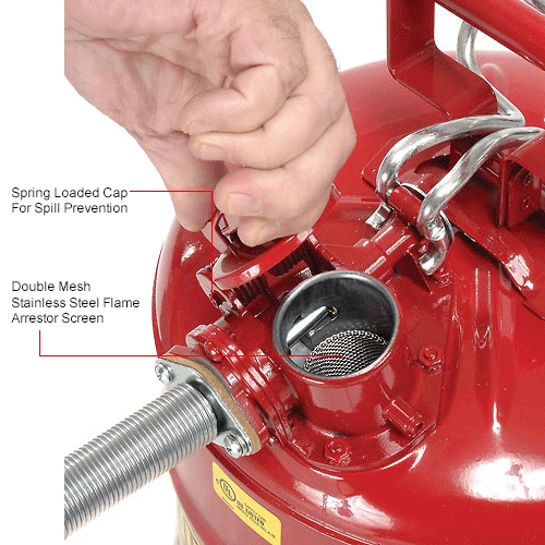 Handle flammable liquids safely and easily! Engineered to help prevent flammables from igniting and to protect personnel from the dangers of fire and explosion. Flashback is prevented by double-mesh flame arrestor screen inside spout. Spring-loaded cap closes automatically after pouring. Long-life synthetic gasket resists virtually all liquids and maintains a tight seal.