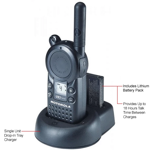 Coverage 15 floors and 200,000 sq. ft. at 1 watt of power. 56 frequencies and 121 interference codes. 4 channels. Lithium battery. 18 hours talk time with 3-hour recharging time in the drop-in tray charger. Choice of 3 call tones. Weighs only 4.5 oz. with battery and measures 2.0″W x 1.1″D x 4.1″H. 1 Year Limited Warranty.