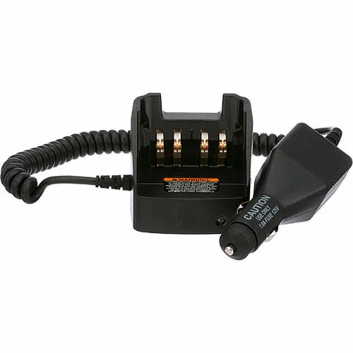 This compact travel charger allows the radio to be used while rapid charging in the charger base. Unit includes a voltage regulated vehicular charger adapter, custom charger base, mounting bracket and coil cord and plugs directly into the vehicle’s cigarette lighter adapter.