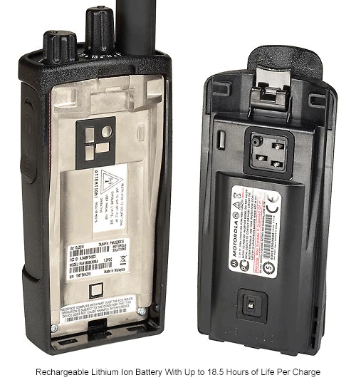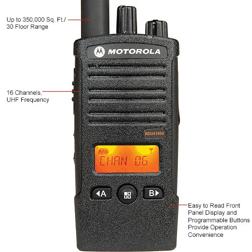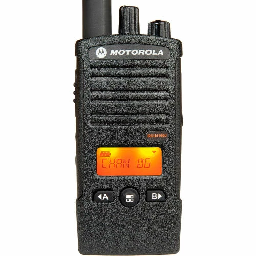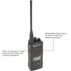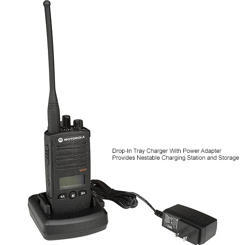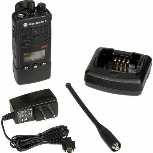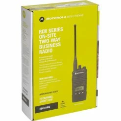 This On-Site Business Two-Way Radio improves productivity, customer service, loss prevention & safety. RDX Series radios provide exceptional audio quality with up to 2000 mW of audio output, speaker magnetic field reduction and wind-noise reduction. Superior durability that meets Military 810 C, D, E and F and IP54/55 specifications for shock and extreme weather resistance. Long battery life with up to 18.5 hours lithium ion battery life per charge. Business exclusive operation on 129 interference codes with 89 UHF frequencies for indoor and outdoor use. Includes rechargeable lithium ion battery, drop-in tray charger with power adapter and 3″ spring belt clip. Compatible with Motorola Solutions XU, AXU and CLS radios. Easy to read display; front panel programmable buttons. All Motorola Solutions radios are backed by a 1 year, over-the-counter exchange warranty.