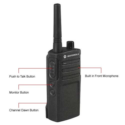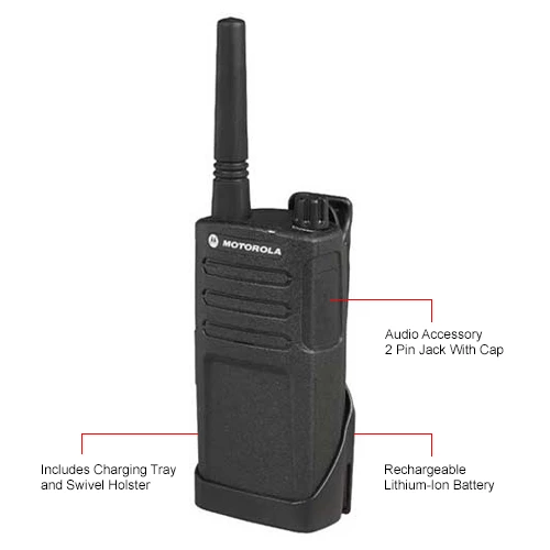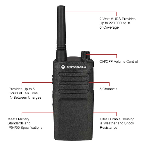 Motorola Solutions 2 watt, 5 channel, MURS business two-way radio. Motorola Solutions RM two-way radios provide exceptional audio quality with up to 2000 mW of audio output, speaker magnetic field reduction and wind-noise reduction. Superior durability that meets military 810 C, D, E, F, G and IP54/55 specifications for shock and extreme weather resistance. Provides an indoor coverage area of up to 220,000 sq. ft. or 13 floors. 15 hours, average life hours. 5 MURS license-free frequencies and 219 codes. 6 customizable codes to help block interference.