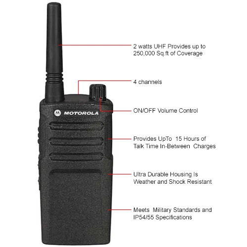 Motorola Solutions 2 watt, 4 channel, UHF business two-way radio. 15 average life hours. Motorola Solutions RM two-way radios provide exceptional audio quality with up to 1500 mW of audio output, speaker magnetic field reduction and wind-noise reduction. Superior durability that meets military 810 C, D, E, F,G and IP54/55 specifications for shock and extreme weather resistance. Provides an indoor coverage area of up to 250,000 sq. ft. or 20 floors. 99 Selectable Business UHF Frequencies and 219 codes, 6 customizable codes help to block interference.