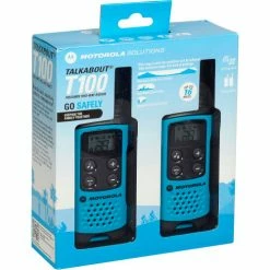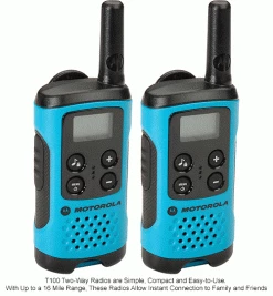 Motorola Talkabout T100 2-Way Radios are designed for indoor and outdoor communication. Simple, compact and easy-to-use by the entire family—when shopping, on the beach or just playing in the park—the T100 series is the perfect way to stay in touch when out and about. With a range of up to 16 miles and freedom to communicate wirelessly, the T100 won’t slow you down. The range in real-life conditions can be reduced from maximum range. Mountain to Valley: Up to 16 miles, Open Water: Up to 3 miles and Neighborhood: Up to .5 miles